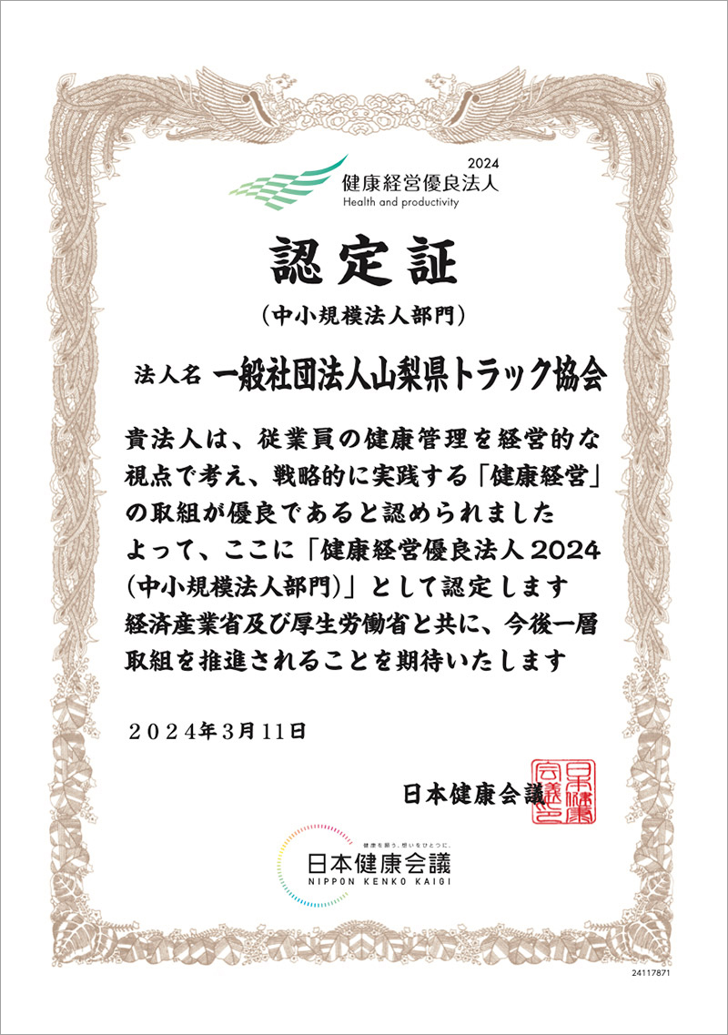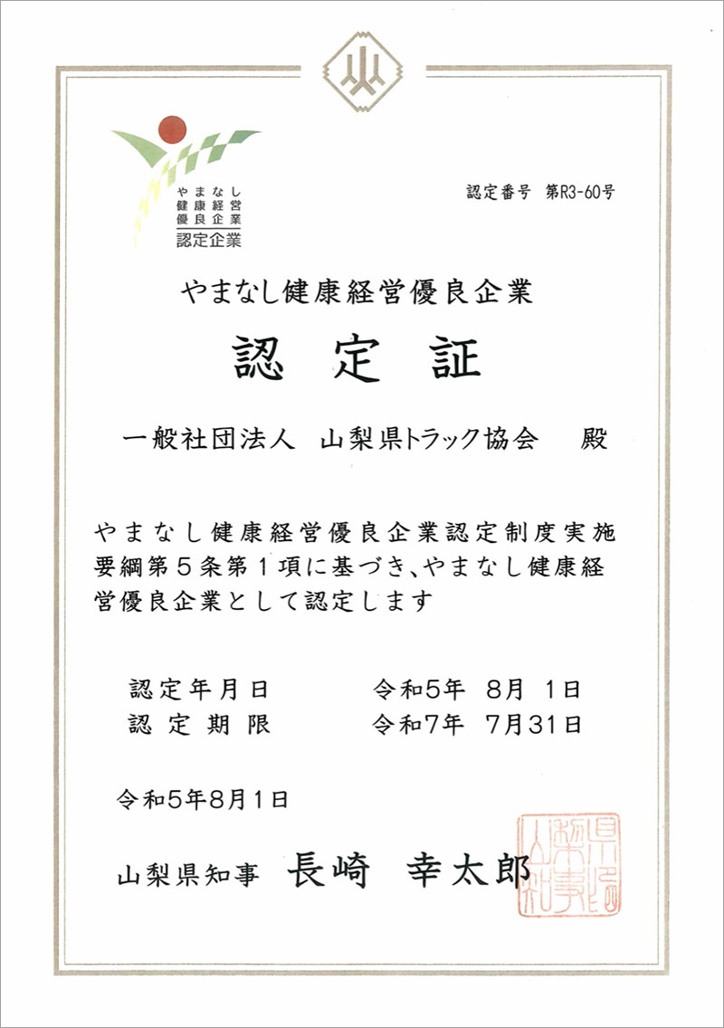 この度、山梨県が独自に認定する制度「やまなし健康経営優良企業」の認定企業として登録され、山梨県より認定証の交付を受けました。